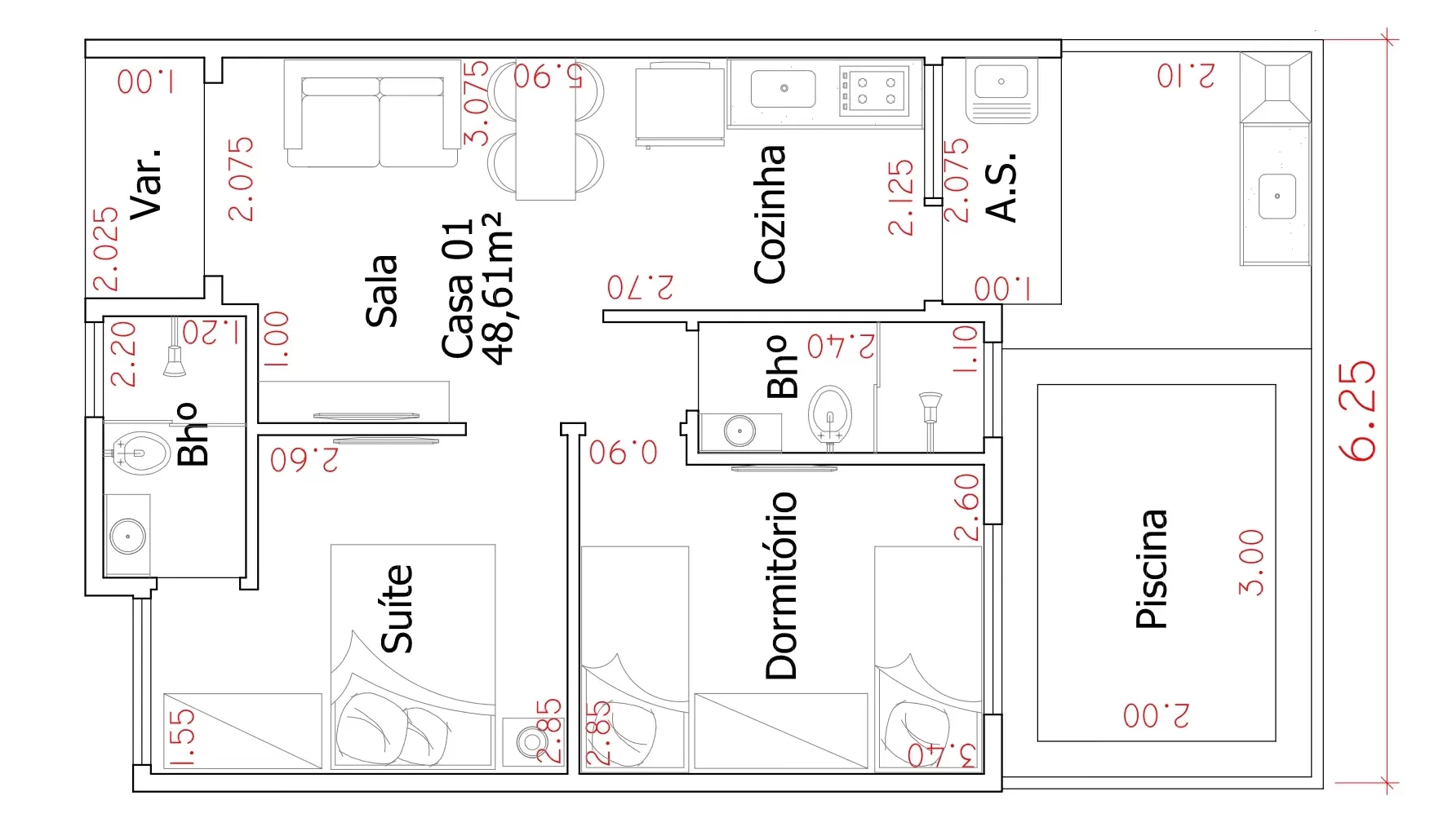 As casas possuem uma planta inteligente que otimiza os ambientes, oferecendo sala de estar e jantar integradas, uma cozinha funcional, dois dormitórios confortáveis e um banheiro bem equipado. A área externa conta com um pequeno quintal privativo, perfeito para montar um jardim, área gourmet ou espaço de convivência.